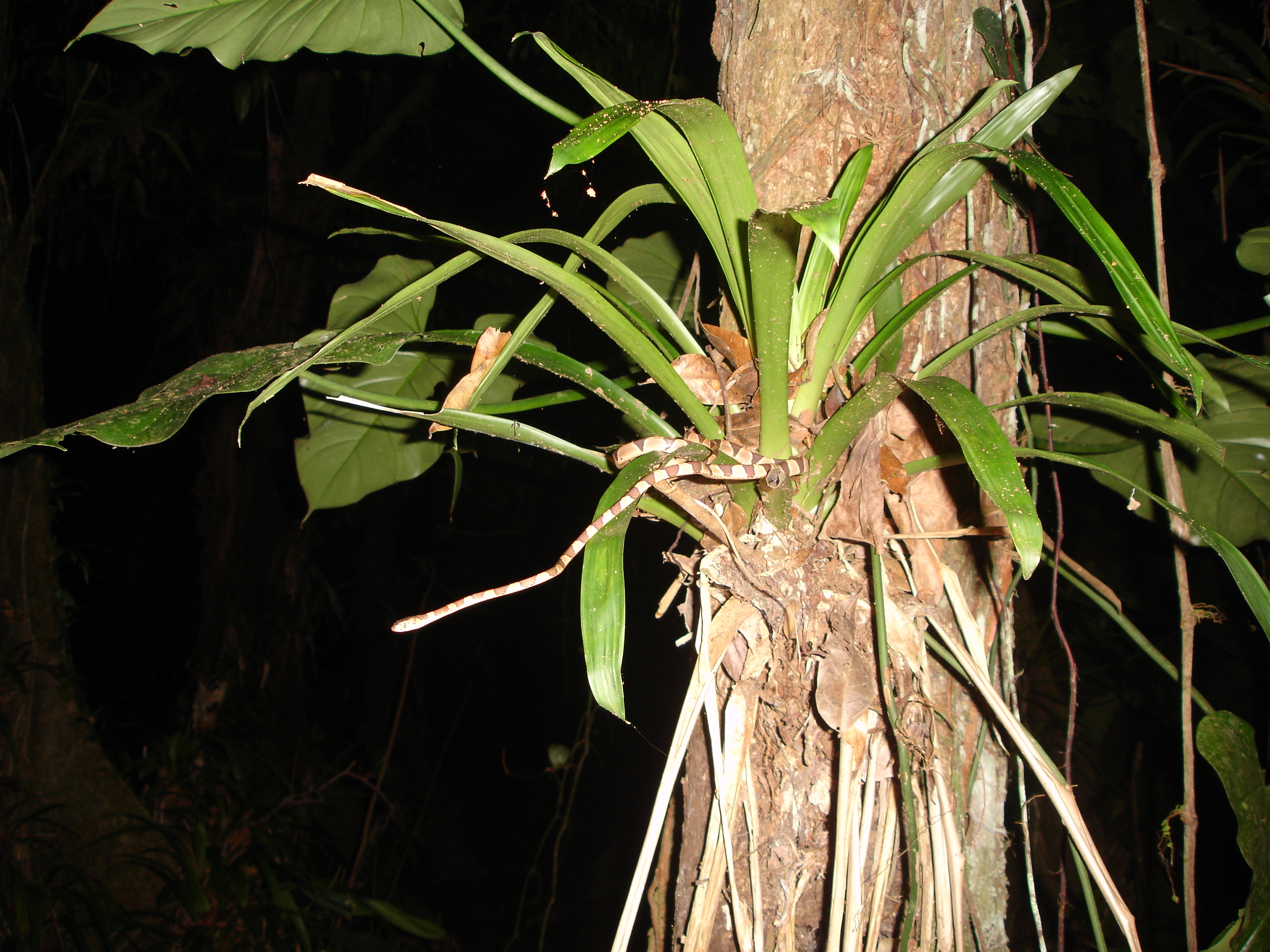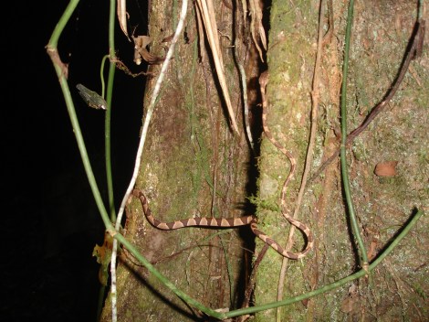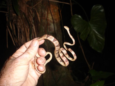 One of the neatest snakes to find at night is the blunthead tree snake, Imantodes cenchoa. These snakes cruise forest vegetation at night searching for sleeping lizards. They are perfectly designed for arboreality and for spanning distances from limb to limb – they are laterally flattened which gives them a huge mechanical advantage for their muscles to hold them steady for relatively long distances as they move from bush to bush, or slowly approach, in the air, a sleeping lizards that has no idea what is coming.