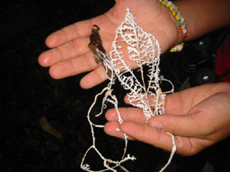 We often encountered this fungus in Cockscomb, and had no idea of its identification. Dr. M. Cathrine Aime, Purdue University (formerly at Louisiana State University AgCenter), identified our photos as the vegetative state of a possibly pathogenic basidiomycetous fungus. She noted that the sexual form has not been found, much less reported. It may cause web blight of leaves, as shown in our bottom photo above.