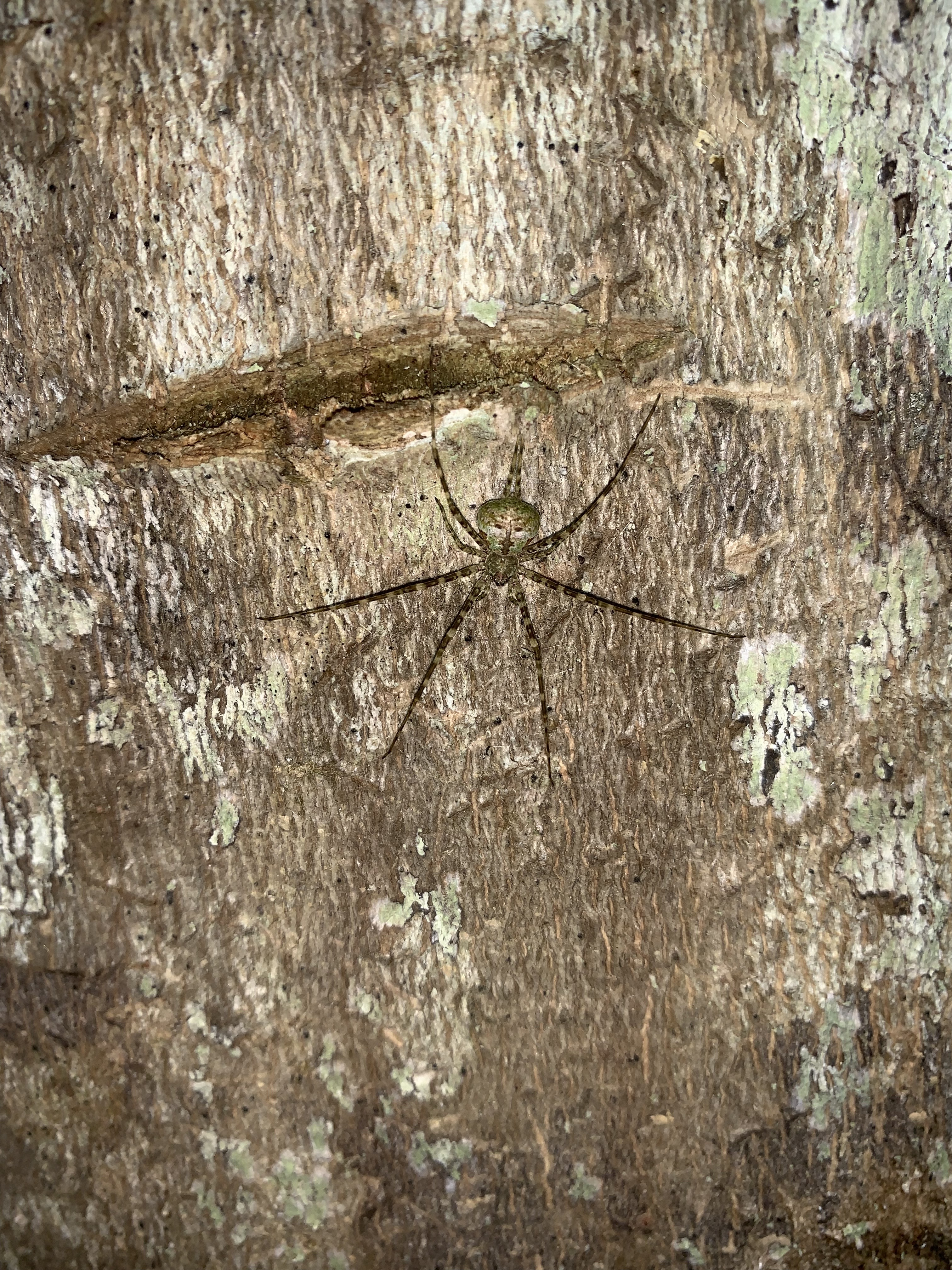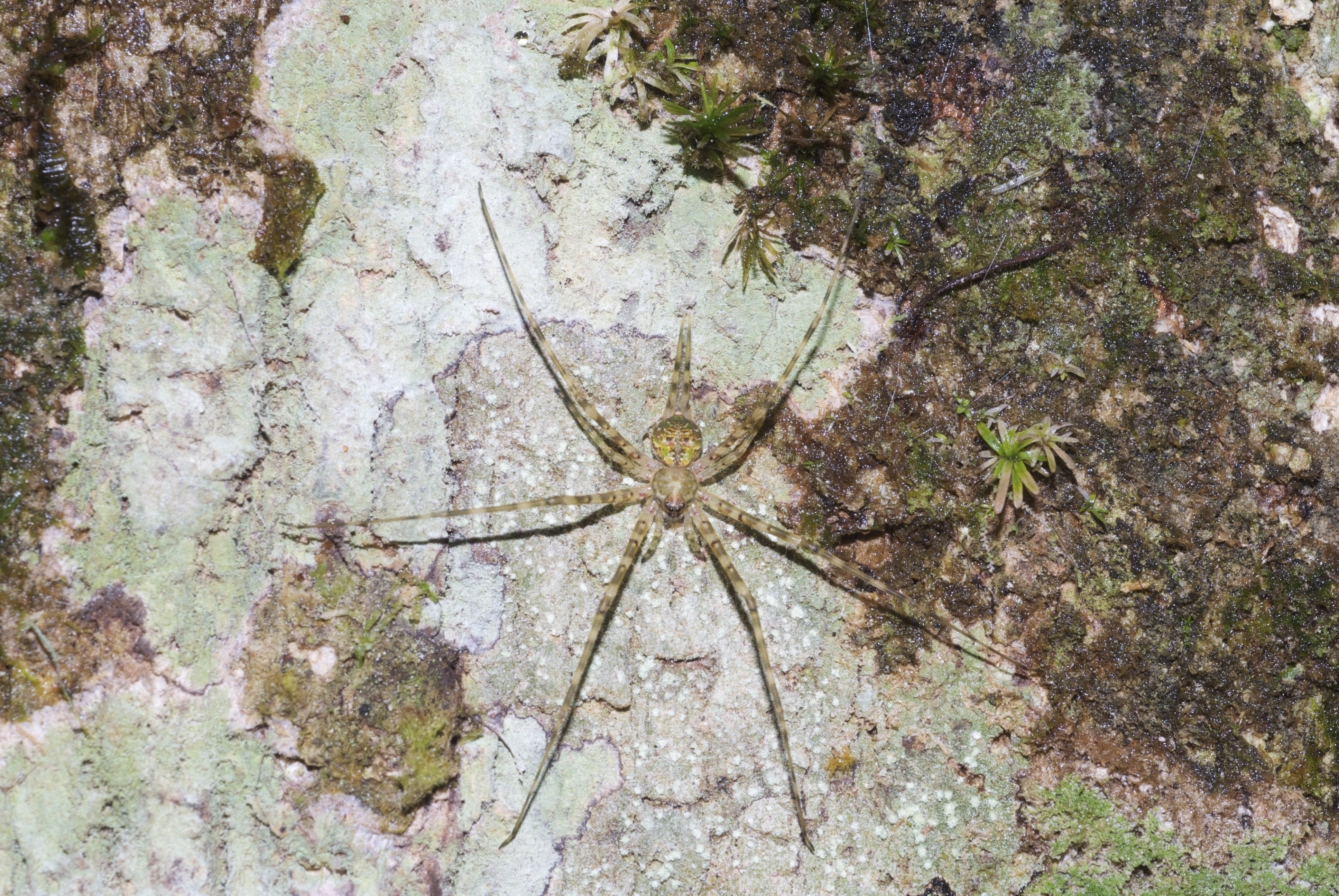 The Two-tailed Spider or Tree Trunk Spider, Neotama mexicana, is a member of the Family Hersiliidae and ranges from the United States to at least Peru and across northern South America. They have very long spinnerets on the rear of the abdomen, and are cryptic while sitting on lichens on tree trunks. This habit is so common that for years we simply called them lichen spiders. When disturbed, they move very quickly.