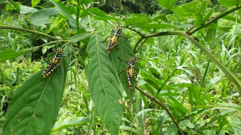 The nymphs, however, don’t resemble the adults, being black, white, and yellow. For many years we called them Tiger Grasshoppers. As in many brightly colored animals, these animals have toxic qualities, as predators quickly learn when they bite them.