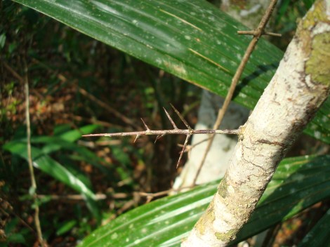 This image, taken in Tikal in May 2008, shows a single, yet typically multipointed, thorn. It is not unusual to find hundreds clustered around the trunk, and one can imagine that this was a very effective means of protecting the tree while allowing access to the seed pods around the periphery of the rather low canopy.