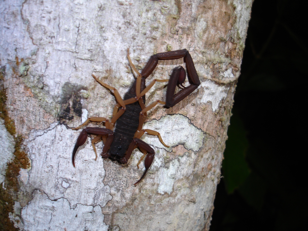 Forest scorpions often perch on tree trunks, but are also encountered moving on the forest floor. Cockscomb Basin Wildlife Sanctuary, Belize, May 2012. Photo by Bob Thomas.