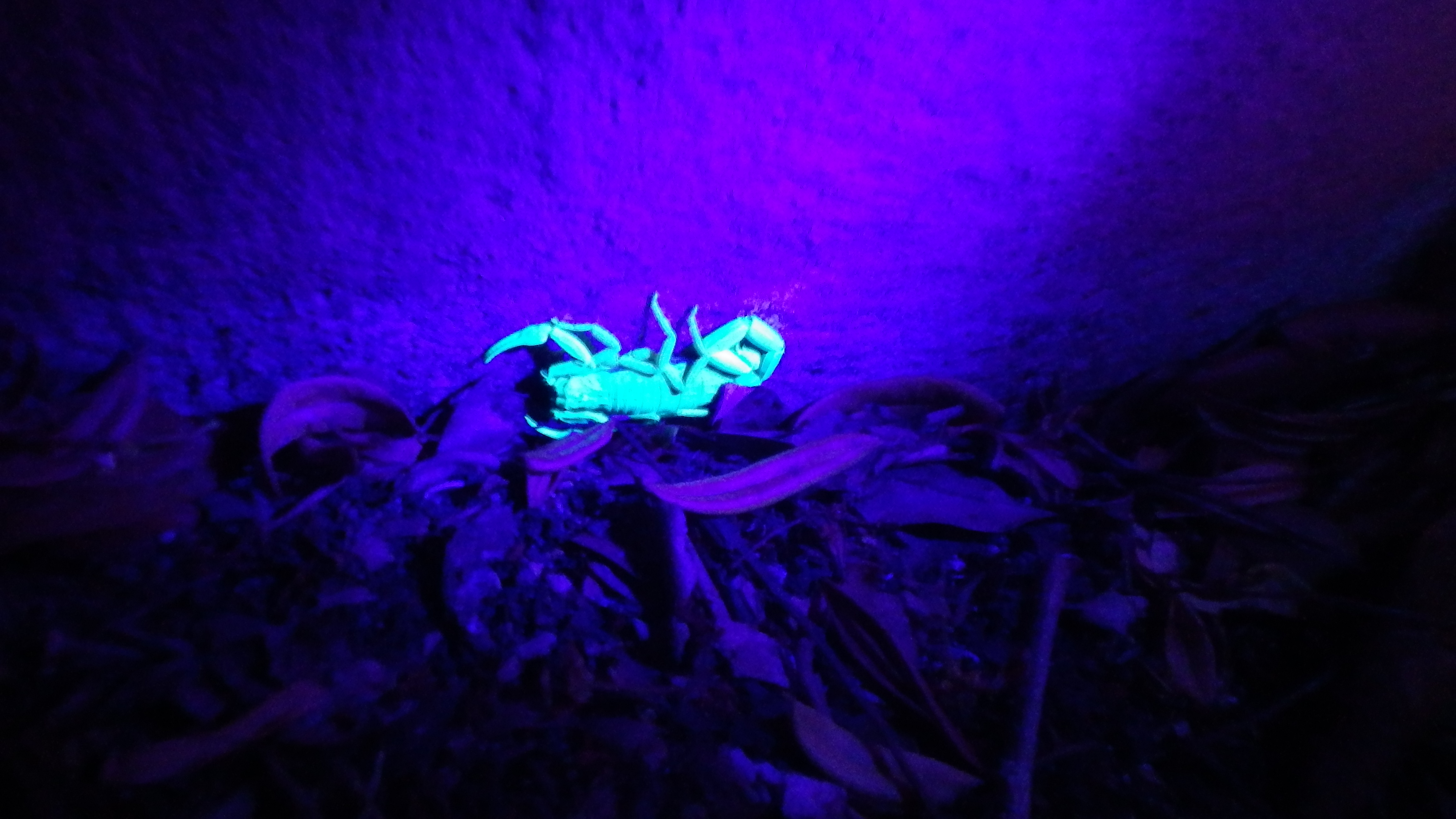 They fluoresce in ultraviolet light, and experts search for them using UV light. University of Oklahoma scientist Douglas Gaffin found that scorpions detect ultraviolet light over most of their body, and may use that sensation to know, for example, when they are safe under a shelter if the UV light is diminished. Certainly more study will reveal additional uses of their being able to “see” with ultraviolet light.