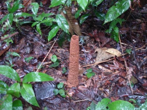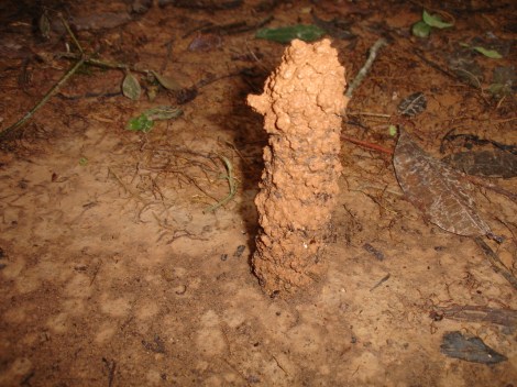 These mounds, or turrets, are constructed by an unobserved cicada species. They and many others were observed in Tambopata National Park, Peru, in the vicinity of the Refugio Amazonas Lodge.