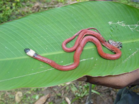 This juvenile mussurana was found along a trail deep in the Chiquibul National Forest. Someone had been chopping on a felled tree and they chopped the snake. A lizard is protruding from the wound.