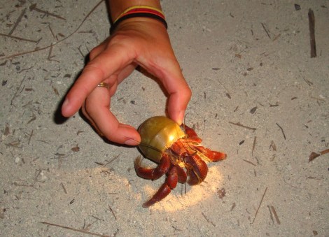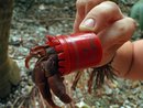 The Caribbean hermit crab is common on most cayes of the Caribbean. In Belize, its favored shell is the West Indian top shell, Cittarium pica. It is, however, found in other shells when young. Like most hermits, it will occupy anything that works, like the random plastic cap and the Smirnoff Vodka caps, above.