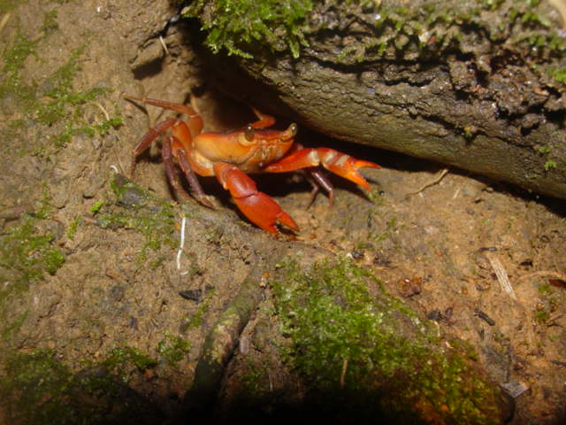 Manicou crabs are abundant along the trails and the entrance road at Asa Wright, as well as the entire Arima Valley. They are land crabs, but their larvae need to develop in water. The female (lower photo) keeps her eggs attached to her swimmeretes (pleopods). When they hatch, she makes her way to water and releases them.