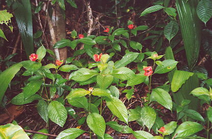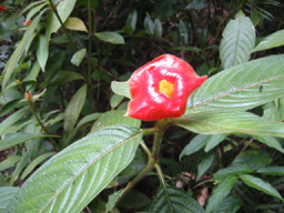 One of the first flowers everyone learns in the Neotropics is Hot Lips, a species of the Rubiaceae. It is a requisite that one places them in the mouth and poses for a photo! They are abundant along trails in the rainforest. The flowers are yellow and are in the center of the red bracts (that most think are the flowers, but actually function in attracting hummingbird pollinators). The fruit are a beautiful royal blue.