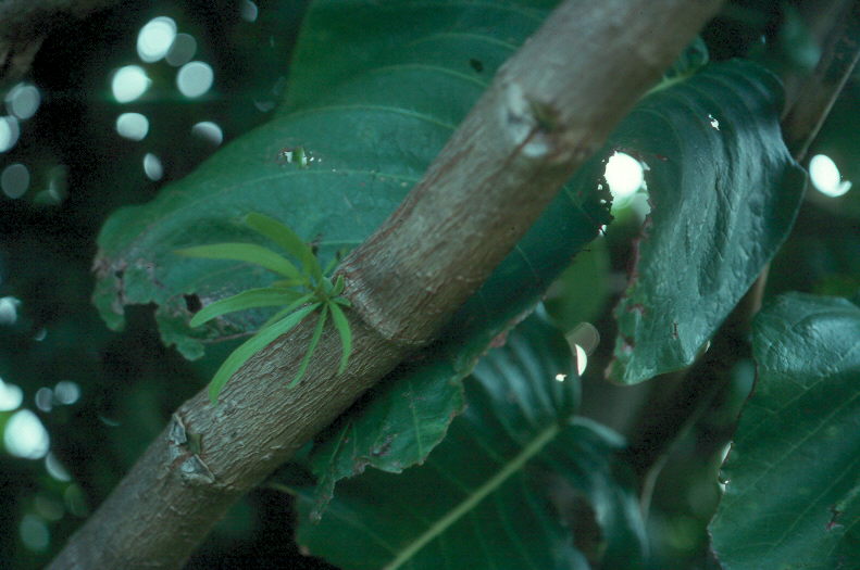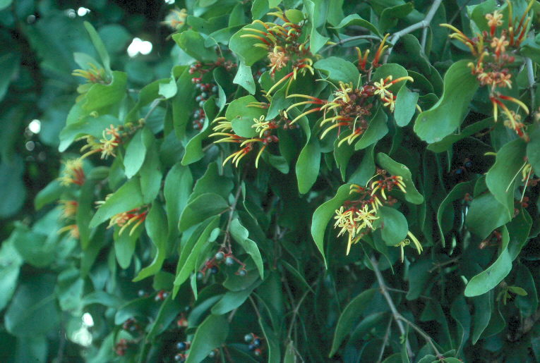 The plant (upper) is very dense and has showy flowers. The very sticky seed (center) sticks to the bills of birds. A new plant (bottom) grows from a seed scraped off a bird’s beak on the limb.