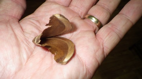 The seeds, an open one shown above, are commonly found around the trees. Since the side of the seed is shaped a bit like a bottlenose dolphin, artists clean them up and sell them as earrings.