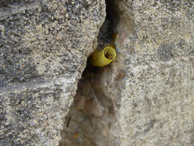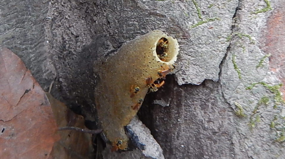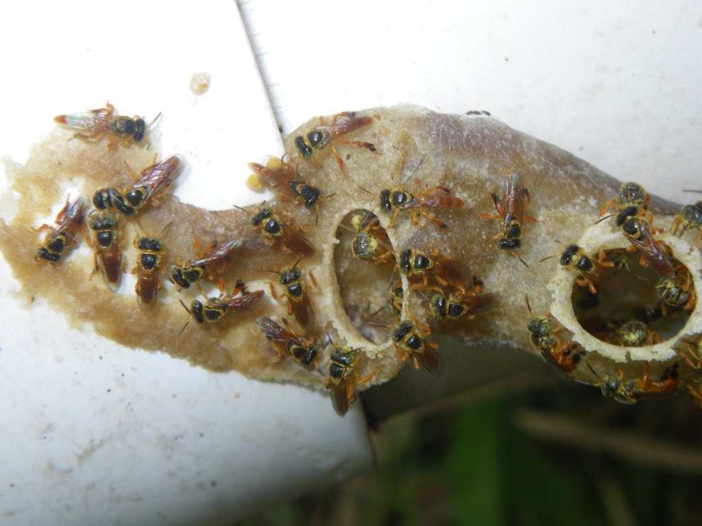 There are a variety of stingless bees in most tropical environments. They construct nests in fissures, holes, etc., and normally have a waxy opening.