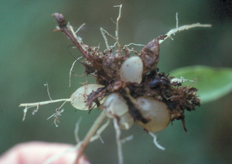 The genus Utricularia is composed of insectivorous species, mostly aquatic. This specimen is of a terrestrial species and was growing along a road cut in the humid cloud forest area. It had a white flower. The “bulbs” that are shown were part of the root system. They are the bladders that capture invertebrates.