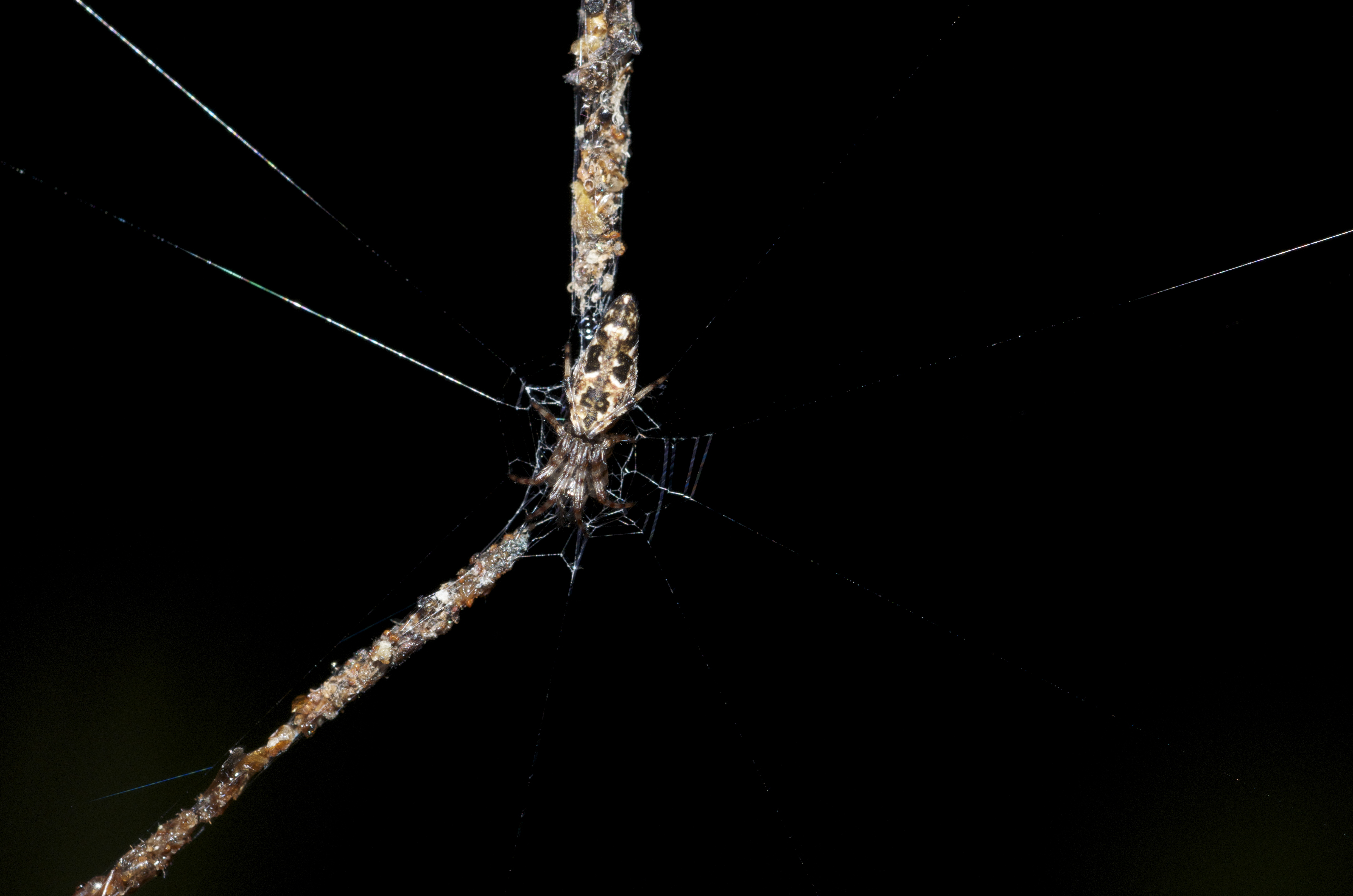 Cyclosa spiders are in the Araneidae family and are orb-web weavers. They build a stabilimentum with debris (often old prey remains) to their web and use it to camouflage.