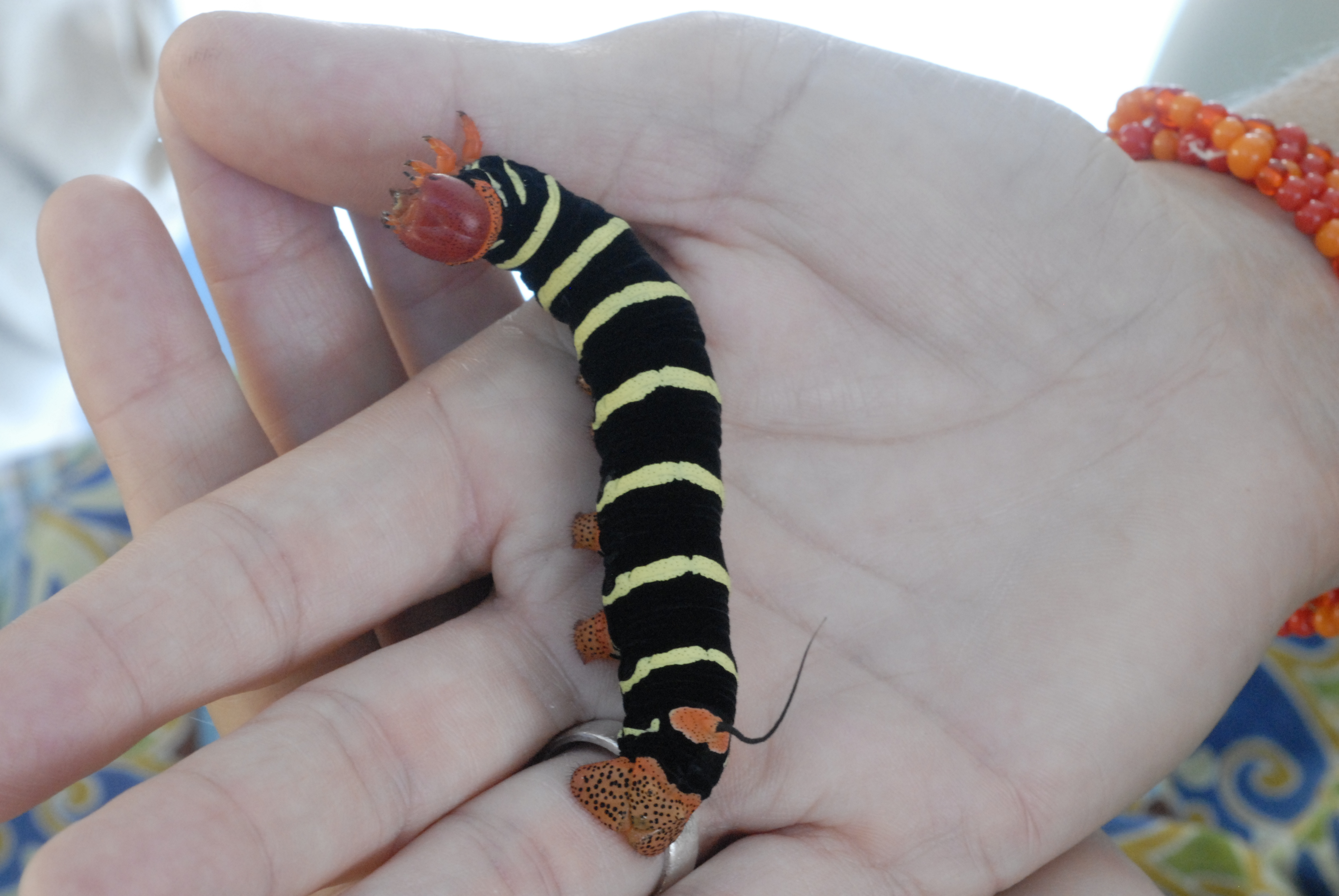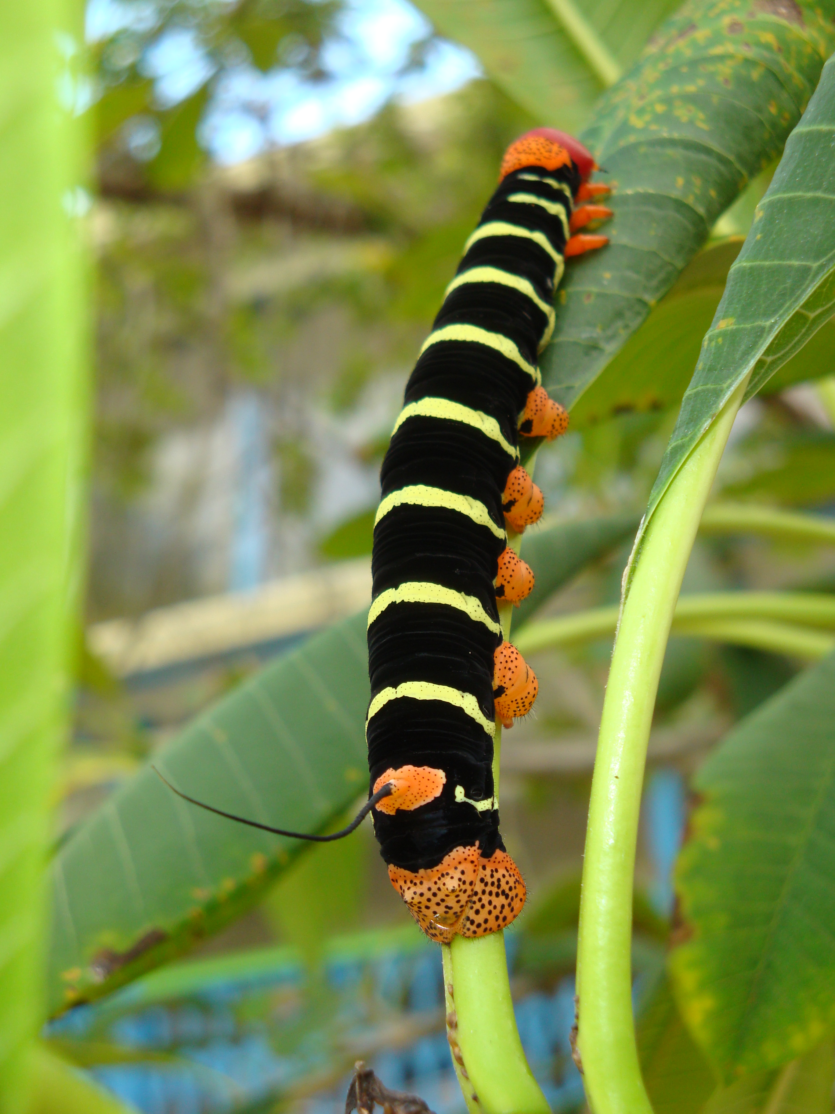 This is the caterpillar of the non-distinct Frangipani Sphinx Moth. It specializes on feeding on the frangipani plant (Plumeria rubra). It is a wide-spread species in the Neotropics.