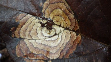 Leaves with this circular pattern were common along the trails at Las Cuevas. They’ve also been seen in the Bladen, according to Steven Brewer. A couple of mycologists who specialize in fungal leaf infestations have opined that this may be Pestalotiopsis. Any ideas?