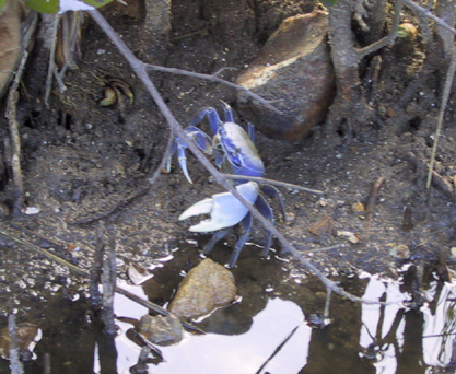Blue land crabs are a delicacy throughout Latin America and the Caribbean where they occur. It is not uncommon to see vendors standing on the side of the road holding a string of them up for sale. The blue bucket above has some at a boat launch. The color of the water wasn’t encouraging, nor was the odor!