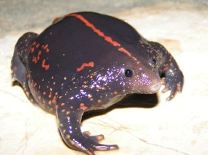 Among the weirder critters in the Neotropics are the Middle American Burrowing Toads of the monotypic family Rhinophrynidae. They burrow by using cornified spades on their hallux and metatarsals, and they back into the soil as they dig – often spiraling down. During the wet season, they may only be about 2-5 inches beneath the surface, but it is presumed they go much deeper during the dry season. Once underground, they create a little room whose diameter is near the total length of the frog. They do not form a cocoon, and if unearthed become immediately active. The toads do feed on ants and termites while burrowed.