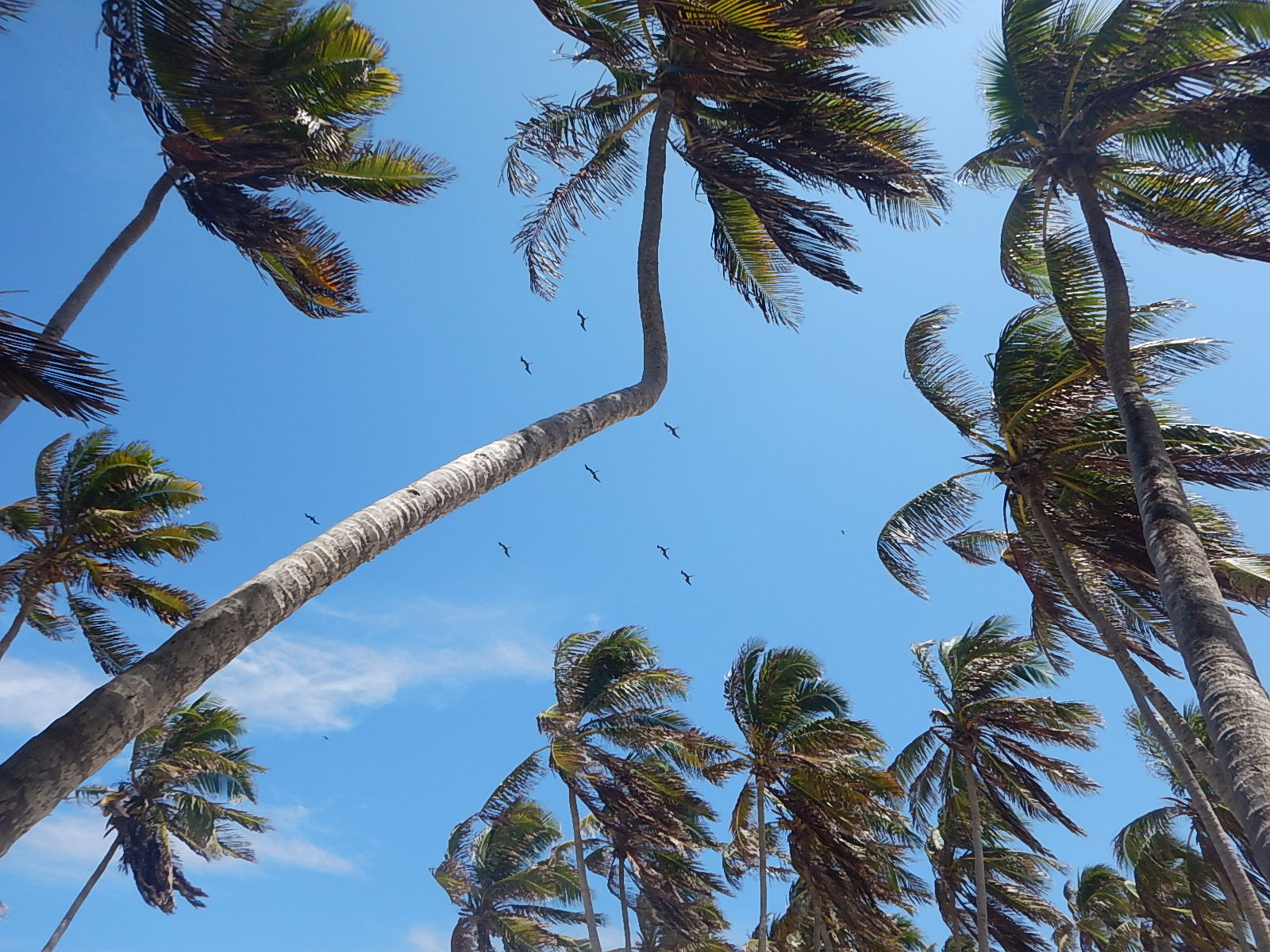 But what we enjoy is watching the interactions (usually from our hammocks hanging from coconut trees) when frigates hang effortlessly in the winds, facing the sea, with a careful eye out for boobies returning to shore with a load of fresh fish to feed their young. This occurs to some extent all day long, but is most common late in the day. The boobies are well aware of the pirates (hence the nickname “man-o’-war bird”) sitting in wait, so they tend to fly low and rapidly in their attempts to reach their nests. The frigates, however, dive down and acrobatically engage the boobies, harassing them repeatedly hoping the booby will drop its load of food. If they do, the frigate adroitly snatches it from midair – mission accomplished. If that first line of attack is not bad enough, there are usually a number of frigates hovering around the shared nesting sites for a second onslaught by hungry birds.