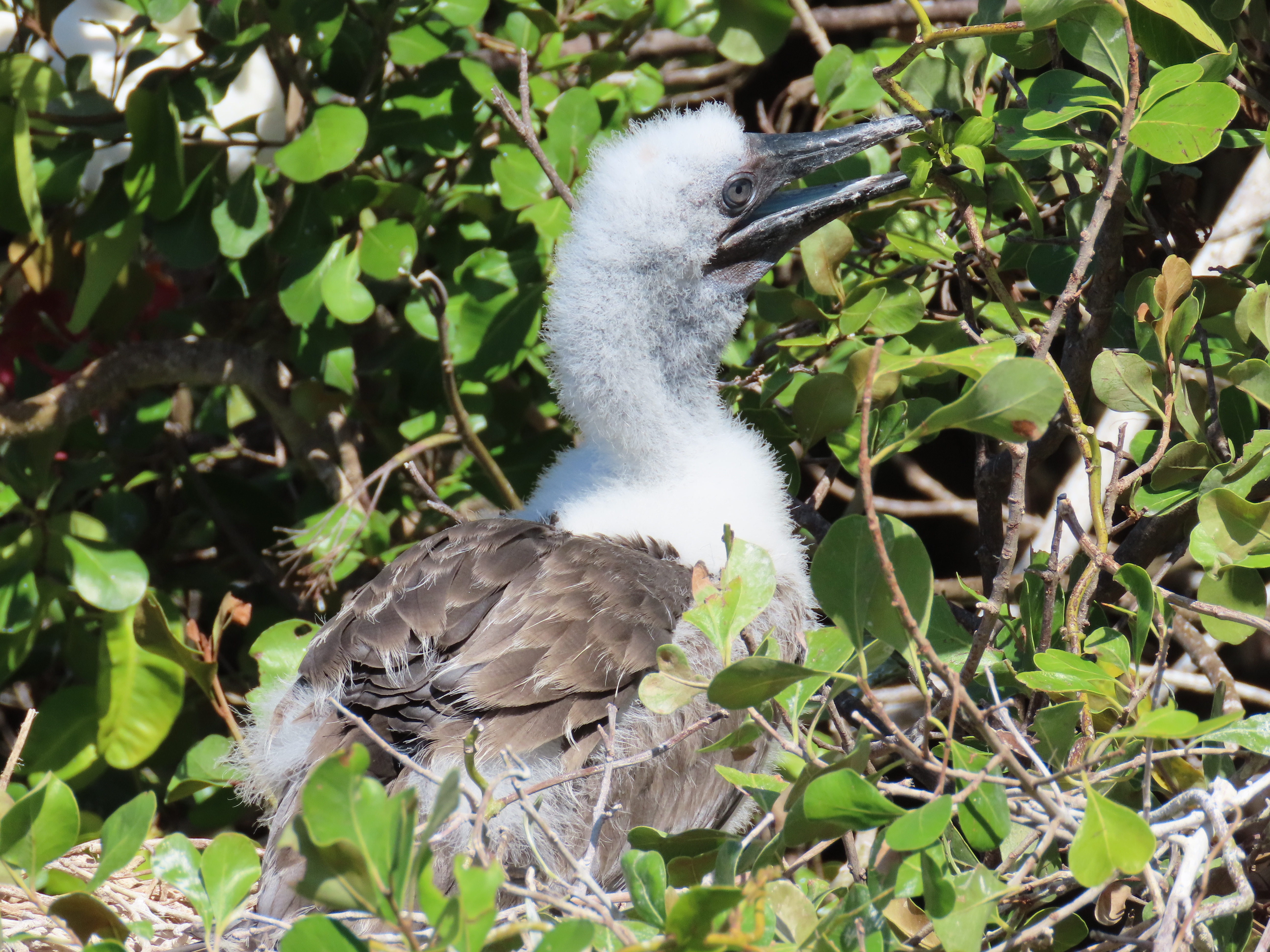 Happily for the frigates, this is a successful way to feed – called kleptoparasitism, or parasitizing boobies by stealing their hard-earned food with much less effort than finding their own. Happily for the boobies, their rapid runs through the frigate gauntlet are successful enough for them and their nestlings to have a good percentage of survival. And, happily for tropical biologists, that this is yet another excellent example to observe of behavioral approaches to resource acquisition.