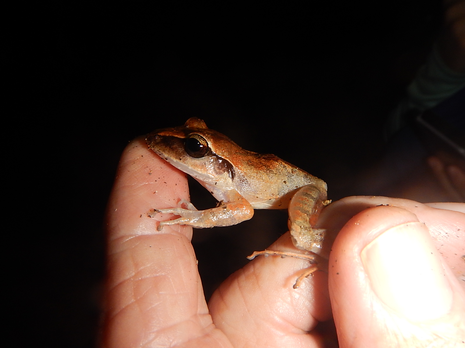 Izabal Robber Frogs are denizens of the leaf litter on the forest floor of tropical forests in Belize, Guatemala, Honduras, and probably a small area in southern México. Looking at these photos, it is clear why they choose to be terrestrial in leaf littered areas – they are very difficult to see in the similarly colored and patterned leaves. They are mostly found when they jump, often surprising distances due to their long legs.