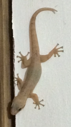 A leaf-toed gecko searching for food on a coconut tree. It shows the pattern that is typical when they are found during the day, but the toes are tell-tale. Photo by Bob Thomas.