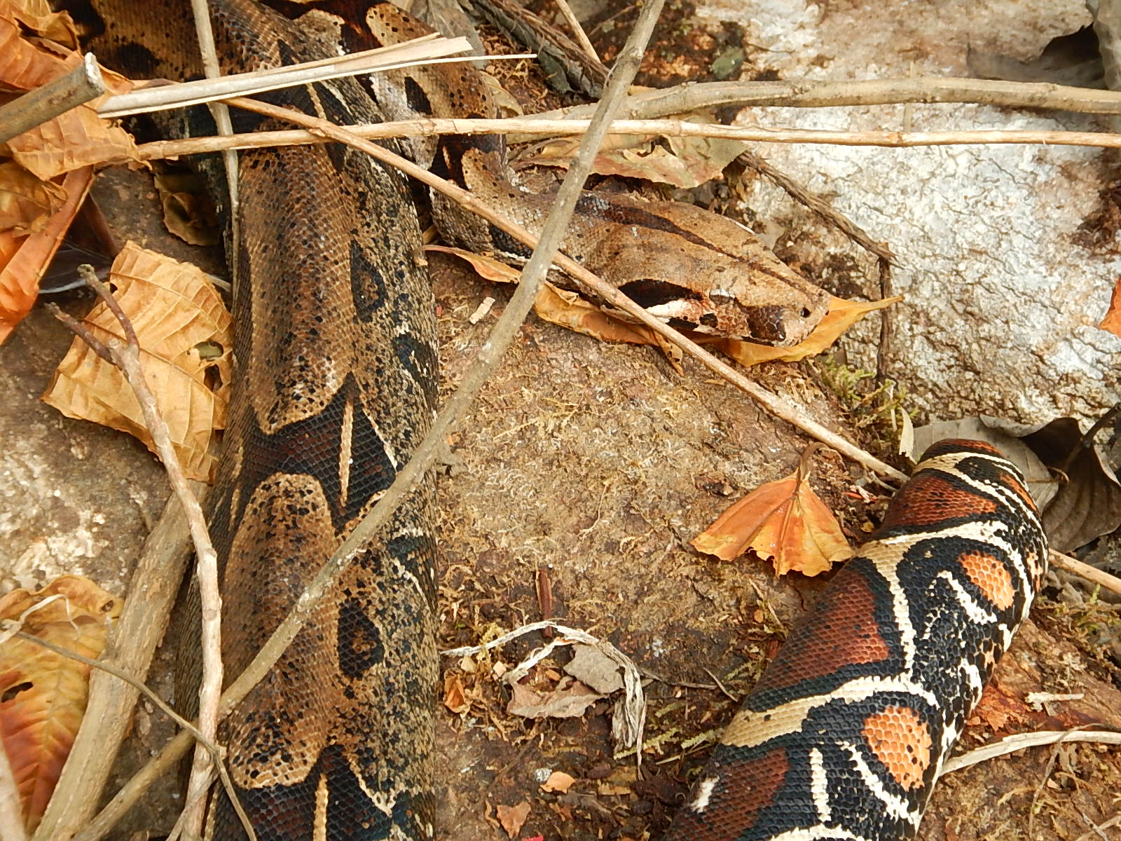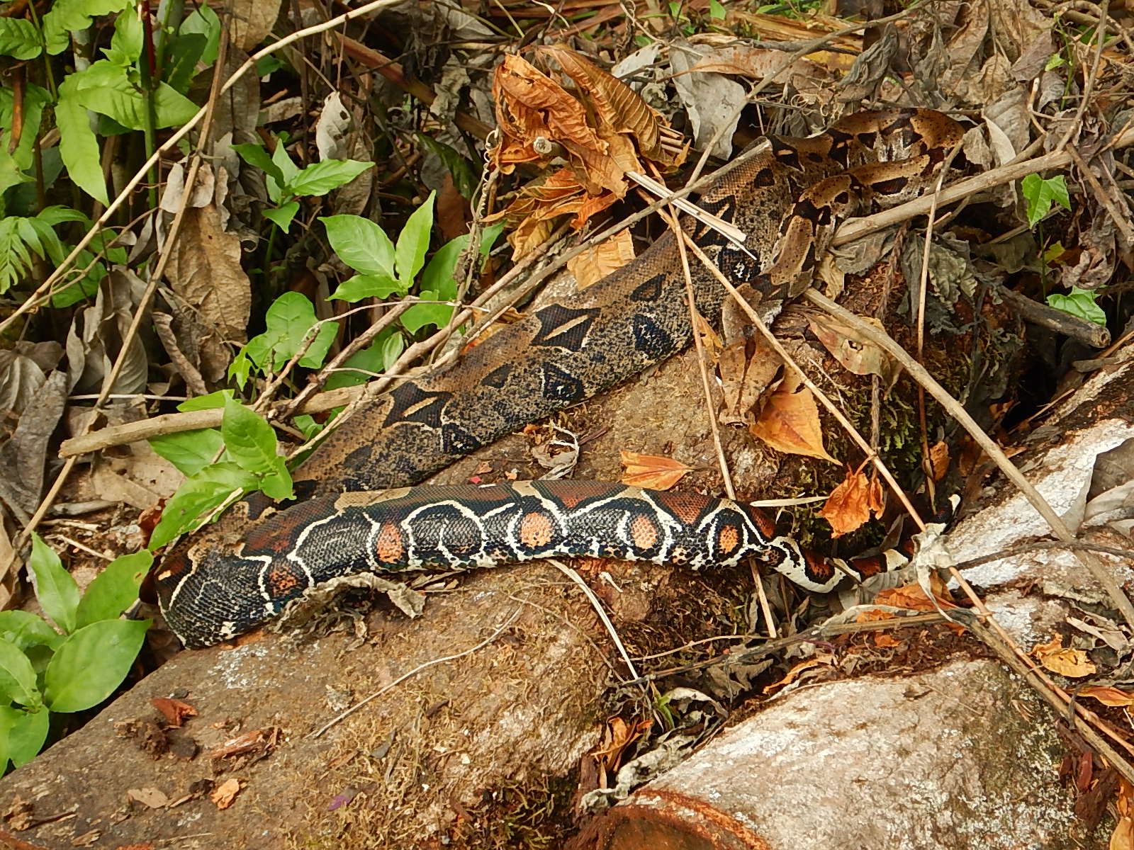 Trinidad red-tailed boa, Boa constrictor constrictor found at Asa Wright Nature Centre, Arima Valley, Trinidad. The snake was sunning on a log pile just outside of a meeting room. Obvious when one focuses on the animal, but very well camouflaged when just walking by. Photos by Bob Thomas.