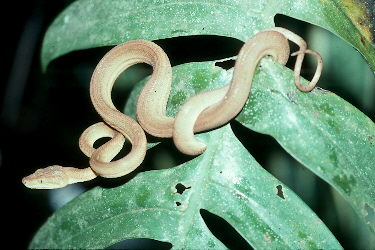Somewhat common in Trinidad, these attractive tan snakes are arboreal, reach 2.5 m in length, and are often most active nocturnally. Their eyes shine red in lightshine.